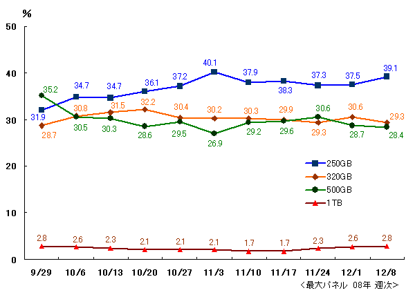 こうしたBDの普及をけん引するのはHDD容量が250GBの低価格モデル。12月第2週の販売台数構成比では39.1%を占め最も多く売れている。人気の理由は価格の安さ。BDの250GBモデルの平均単価は7万4200円と全体に比べ1万8100円も安い。一方、従来型のDVDなどのレコーダー(以下DVD)は250GBモデルの平均単価が5万600円。両者の差が2万3600円と接近していることも、BDへの買い替え需要を後押ししているようだ。