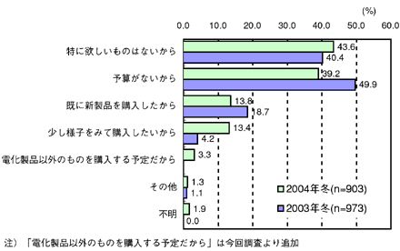 また、電化製品の「購入予定はない」とした回答者に、購入予定がない理由を尋ねたところ、「特に欲しいものがないから」(43.6%)とする回答が最も多く、4割強を占めた(図5)。前年冬と比較すると、前回トップだった「予算がないから」とする割合が10.7ポイント減少した一方、「特に欲しいものはないから」とする割合が3.2ポイント増加している。ボーナスの受給状況が改善の見通しとなるなか、「特に欲しものがないから」とする割合が高まっており、今後はこうした層への需要喚起に向けた施策が重要な課題になってくると思われる。