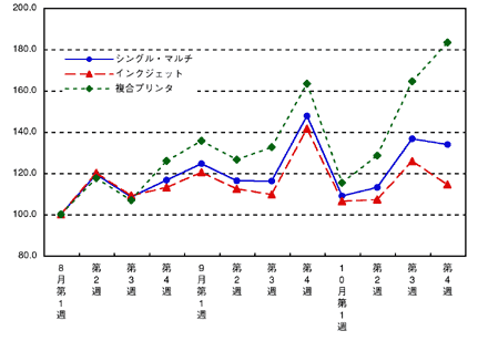 10月に入って主要プリンタメーカーから順次新モデルが投入され、11月までにほぼ全機種が出揃った。2004年8月第1週を100とする指数をみると、10月第1週は大きな落ち込みをみせたものの、第1週をボトムに以降は概ね増勢傾向で推移しており、特に複合プリンタは大きな伸びを示している(図1)。ただ、インクジェットプリンタ市場(シングルファンクション、マルチファンクション)は前年水準を下回って推移しており、新モデル投入による増勢の動きがどこまで維持できるかは予断を許さない状況となっている。