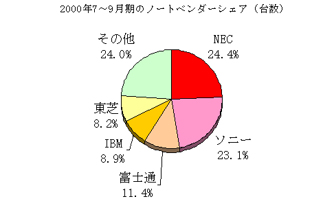 ノートにおいては、ソニーとのトップ争いが激化しており、2000年7~9月期は、NECがなんとかソニーを引き離した格好となった。ベンダーシェアではNECが24.4%でトップだが、2位のソニーが僅かに1.3%差の23.1%でNECに迫っている。3位の富士通は11.4%だ。