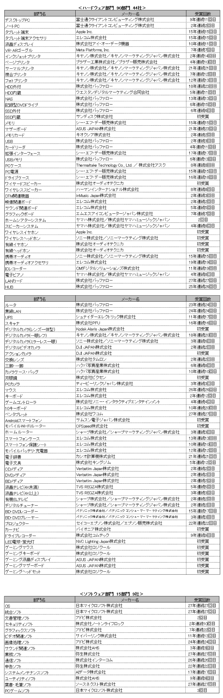 株式会社BCN(本社:東京都千代田区、奥田芳恵 代表取締役社長)は1月19日、「BCN AWARD 2026」各部門のNo.1を発表した。全国の量販店のPOSデータを日次で収集・集計した「BCNランキング」に基づき、パソコン関連・デジタル家電関連製品の年間(1月~12月)販売台数No.1メーカーを称える。27回目を迎えた今回は、105部門で53社がAWARDを獲得。あわせて、ITに取り組む若者を対象としたコンテストで優秀な成績を収めた個人やチームを表彰する「BCN ITジュニア賞2026」の受賞者も発表した。