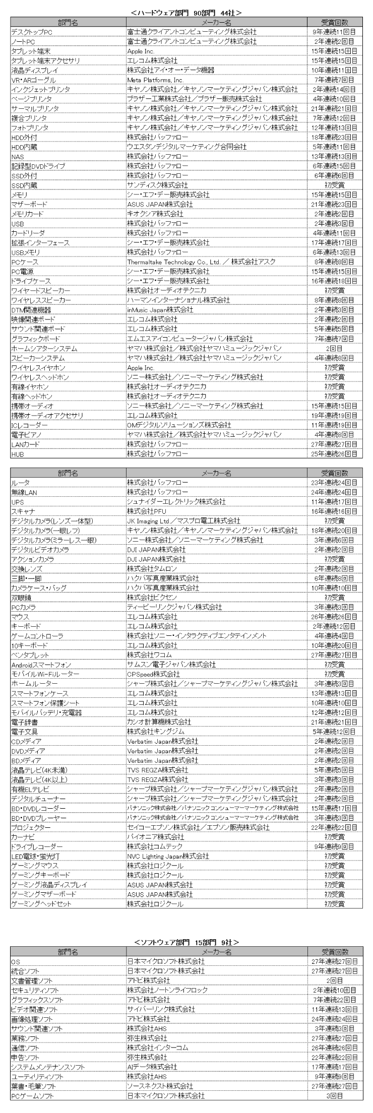 BCN AWARD 2026では、ハードウェア90部門で44社、ソフトウェア15部門で9社がNo.1となった。今回からゲーミング関連(ゲーミングマウス部門、ゲーミングキーボード部門、ゲーミング液晶ディスプレイ部門、ゲーミングマザーボード部門、ゲーミングヘッドセット部門)の5部門を新設。また、これまでヘッドホン・イヤホン(ワイヤレス)部門とヘッドホン・イヤホン(ワイヤード)部門としていたが、ワイヤレスイヤホン部門、ワイヤレスヘッドホン部門、有線イヤホン部門、有線ヘッドホン部門に再構成し、新設部門としている。新設した部門におけるNo.1獲得メーカーを紹介する。まず、ゲーミング関連5部門では以下の通りとなった。ロジクールがゲーミングマウス部門とゲーミングキーボード部門、ゲーミングヘッドセット部門の3部門で獲得。ゲーミング液晶ディスプレイ部門、ゲーミングマザーボード部門の2部門では、ASUSが獲得した。